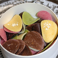 Happysweets 福岡のスイーツブランド Shodai Bio Nature ショウダイビオナチュール の ミルティペタル ポテチのような形の薄いチョコレート 花びらをイメージしてるそう 大きさは一口サイズで小さめですが 6種類の色と味が楽しめる可愛いチョコ 天然